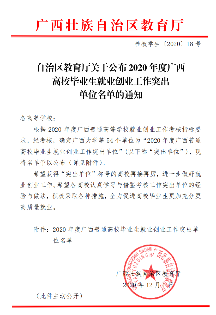 据悉,此次被评为“2020年度广西普通高校毕业生就业创业工作突出单位”的还有广西大学等其他54所高校。(学工部)
