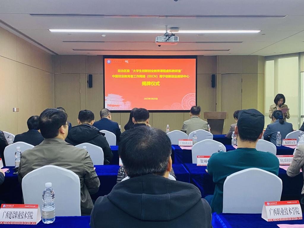3月25日,自治区级“大学生创新创业教育课程虚拟教研室”、中国创业教育者工作网络(EECN)南宁创新创业教研中心揭牌仪式在广西南宁GIG国际金融中心3501会议室举行。167net必赢入口学生工作部(处)长、创新创业学院院长田光灿与各共建院校代表参加揭牌仪式。仪式由广西民族大学创新创业学院院长刘银妹主持。