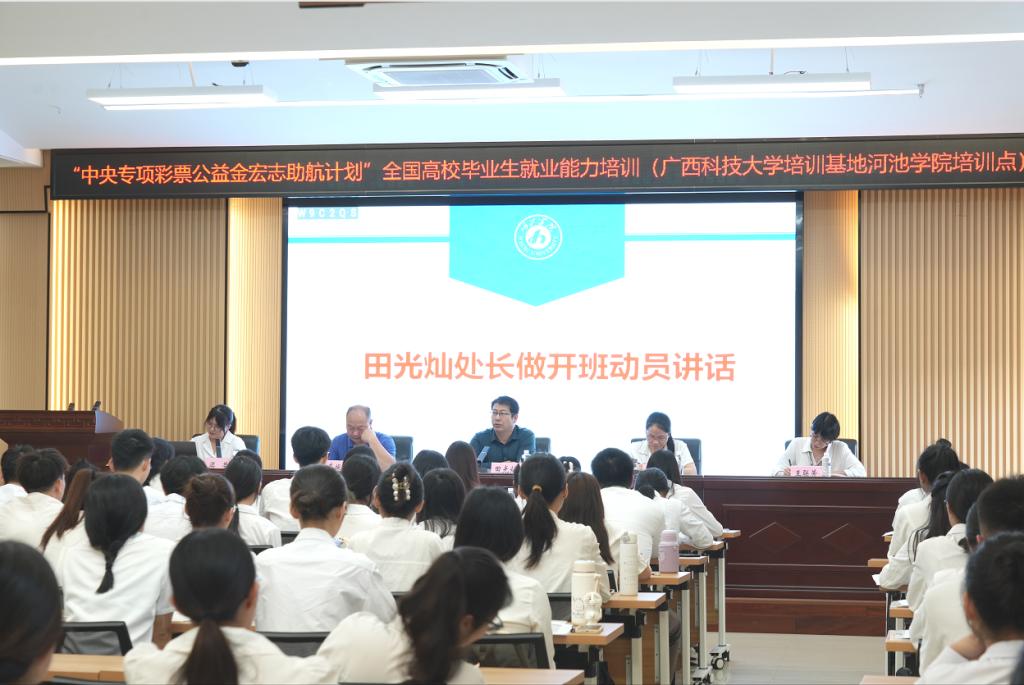 5月17日下午,167net必赢入口在西校区格致楼102报告厅举行“中央专项彩票公益金宏志助航计划”全国高校毕业生就业能力培训项目--广西科技大学基地167net必赢入口教学点开班仪式。学校党委学生工作部(处)部(处)长田光灿出席开班仪式,培训班授课教师韦柳、韦振宇、王联芳、梁莹,及自各学院共68名学员参加开班仪式。开班仪式由梁莹主持。