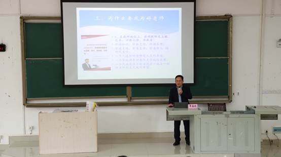 凭祥市凭祥镇中心小学黄博校长围绕《做好学生的引路人》这一主题展开,他结合自己的学习和职业生涯,分别从大道至简——人生的思考、 “为师之道”的追问、新时代教师的使命与担当、 “立德树人”我们在行动、以师者的人格魅力影响学生等五个层面进行深入讲解,提醒即将成为教师的青年学子们“教育要从‘心’出发,要有爱心、童心、耐心、恒心”,作为教师要注重师德师风,做新时代的“四有”好老师,做好学生前进道路上“引路人”。