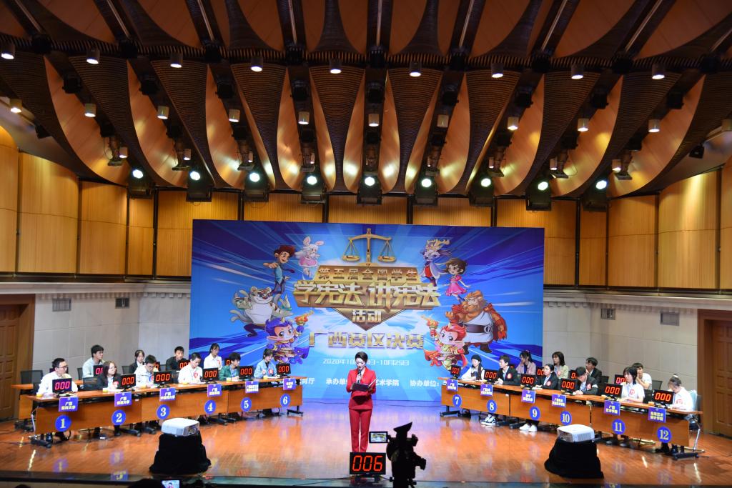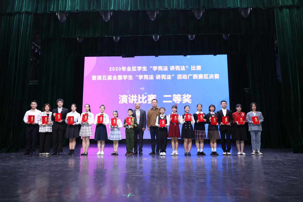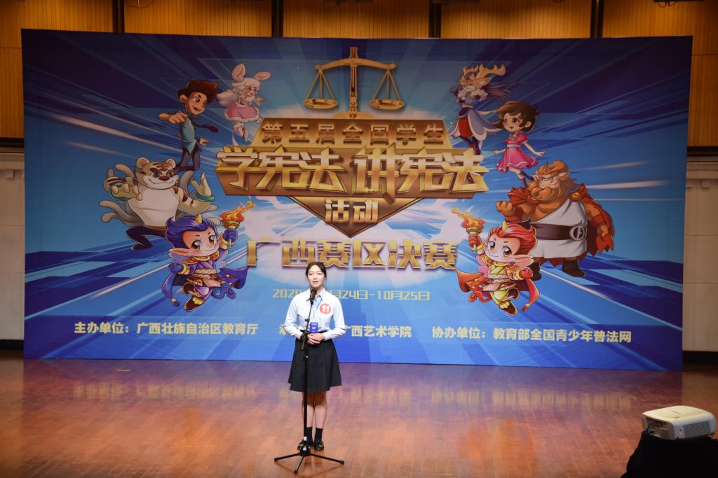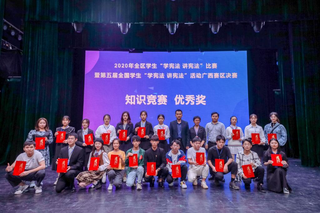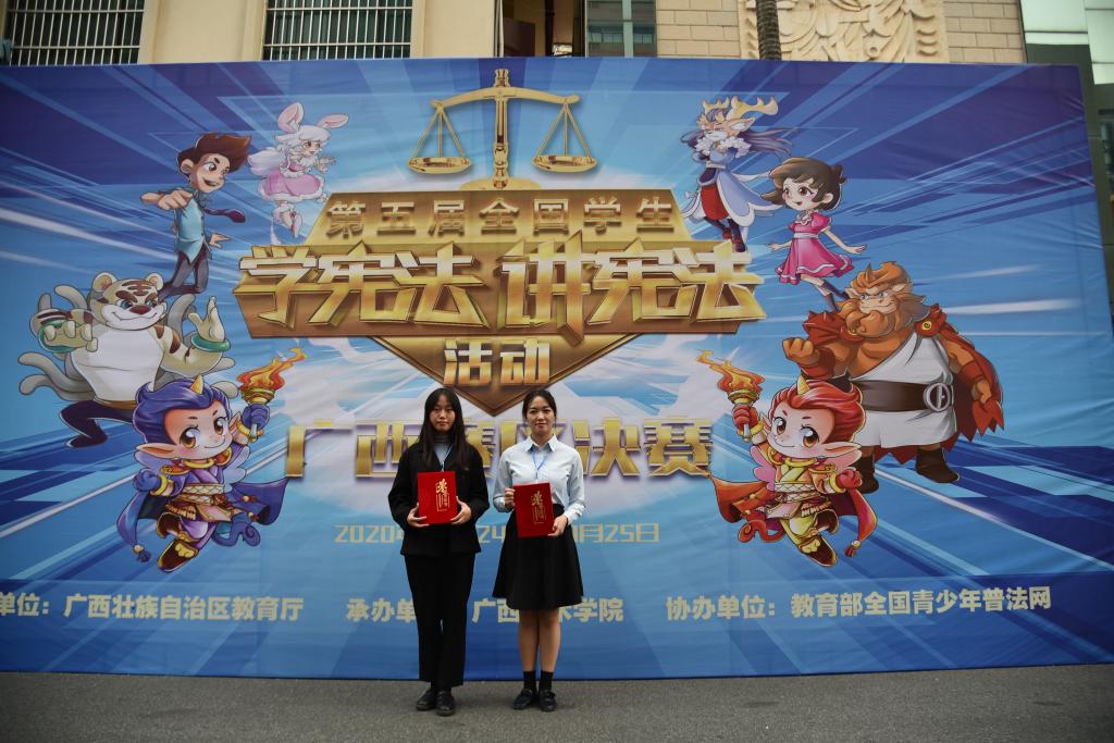 10月24日-25日,2020年全区学生“学宪法 讲宪法”比赛暨第五届全国学生“学宪法 讲宪法”广西赛区决赛在广西艺术学院举行,167net必赢入口文学与传媒学院学生黄泽旭、经济与管理学院学生王震分别荣获高校组“学宪法 讲宪法”演讲比赛二等奖和高校组“学宪法 讲宪法”知识竞赛优秀奖。