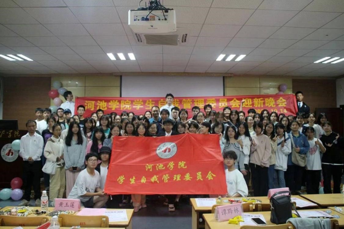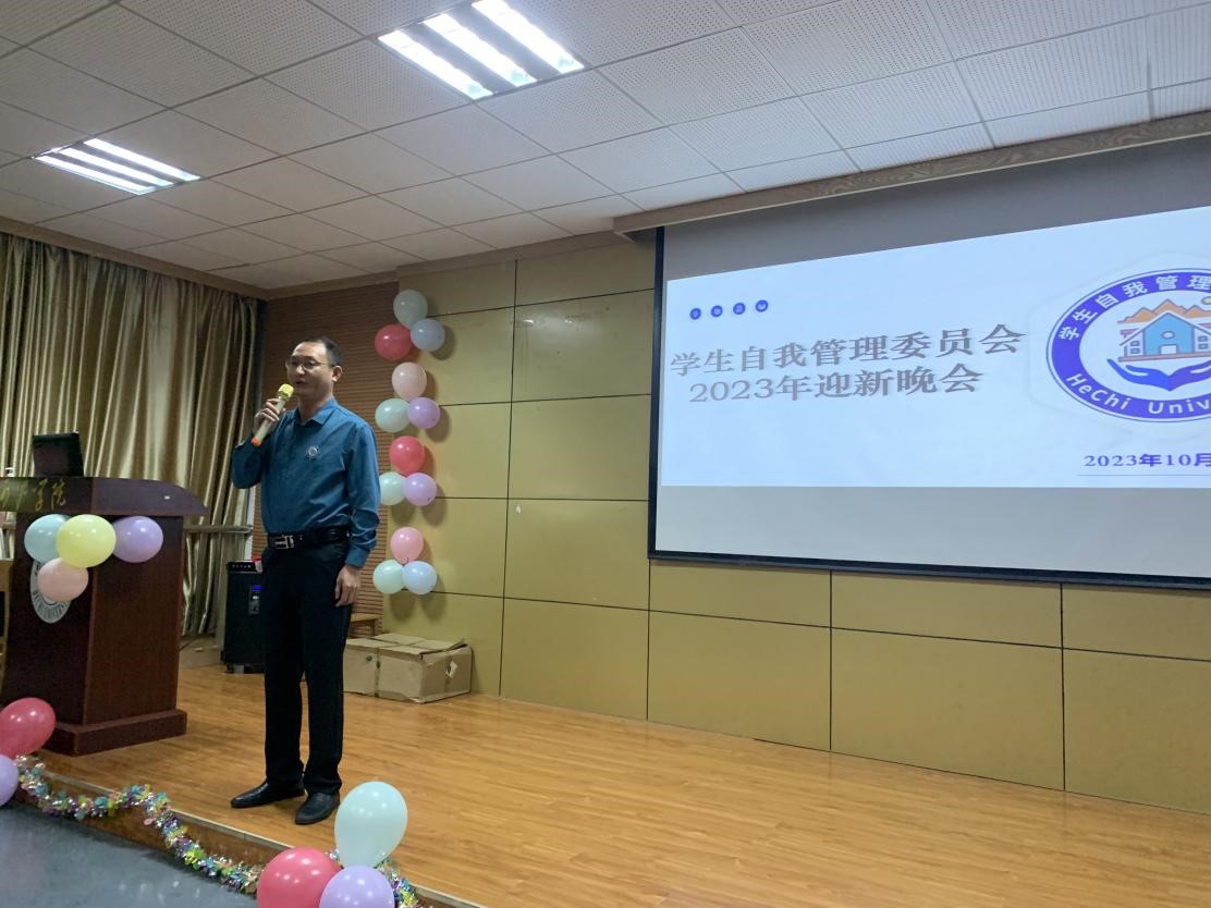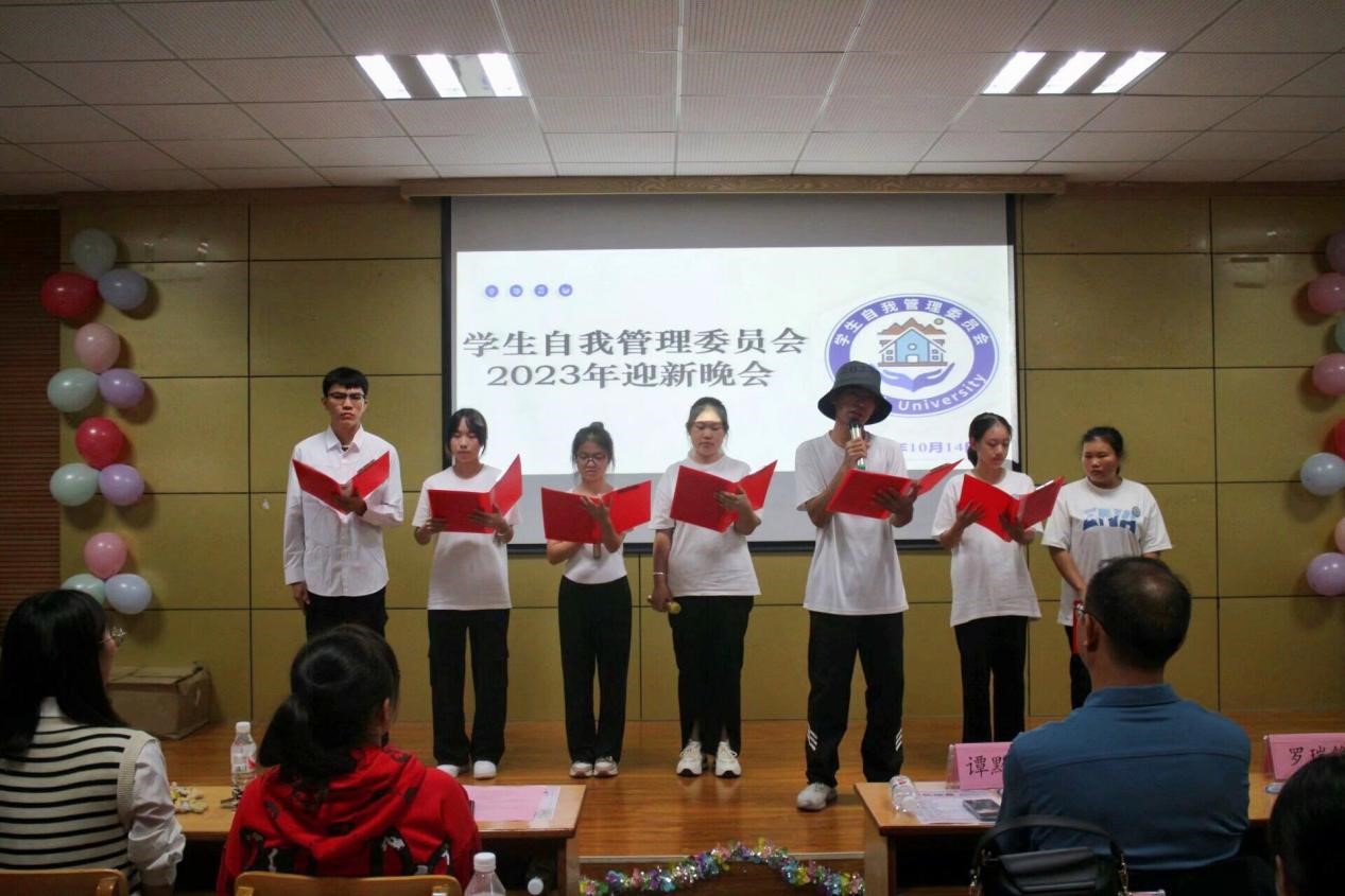 10月14日晚,在“一站式”学生社区举办学生自我管理委员会(下称自管会)迎新晚会,参加此次晚会有学校党委学生工作部(处)副部(处)长谭黔林、自管会指导老师黄玉莲、易班指导老师罗瑞锋,全体自管会成员出席晚会。