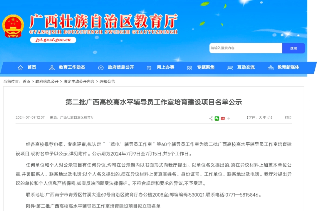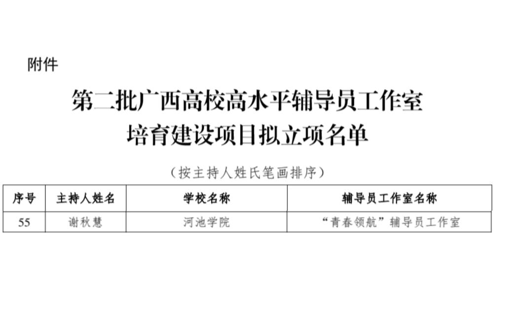 近日,自治区教育厅公布第二批广西高校高水平辅导员工作室培育建设项目公示名单。全区共有60个辅导员工作室入选培育建设项目,167net必赢入口由谢秋慧老师主持的“青春领航”辅导员工作室获得立项。