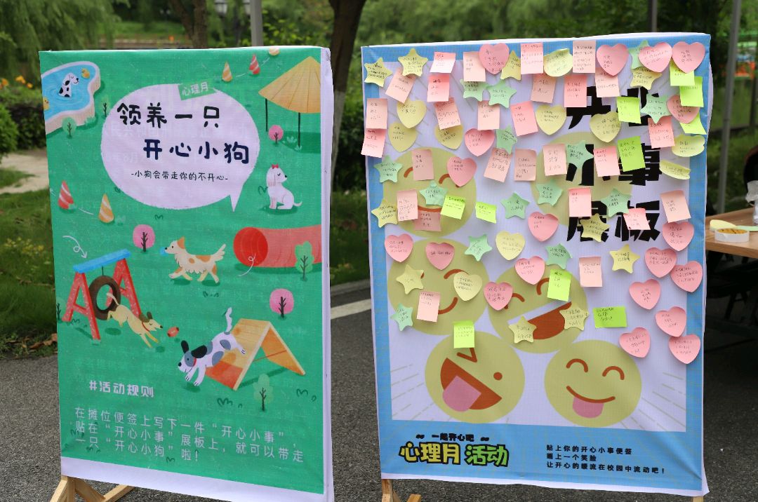 其中,“开心小事展板”前人头攒动,成为活动亮点之一,同学们纷纷用便签记录生活中的温暖瞬间:“室友送的热奶茶”“今天实验成功啦!”……点滴幸福汇聚成一面“心灵彩虹墙”。