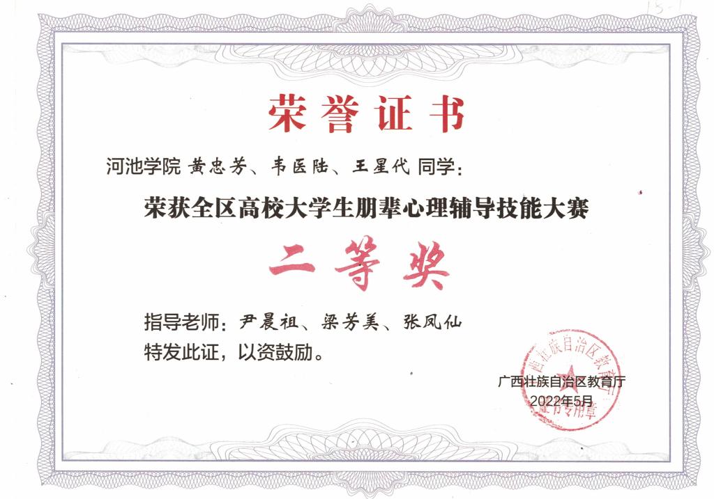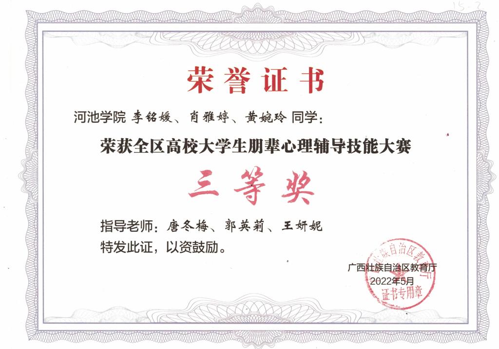 5月28至29日,由自治区教育厅主办、广西财经学院承办的全区高校大学生朋辈心理辅导技能大赛在南宁举行。全区共90多支高校代表队、近600名选手和指导老师参加了本次大赛,167net必赢入口组织选派2支代表队参加此次大赛。经过激烈的角逐,由教师教育学院的黄忠芳、韦医陆和马克思主义学院的王星代三名学生组成的167net必赢入口一队荣获本次大赛二等奖,指导老师尹晨祖、梁芳美、张凤仙;由教师教育学院李铭媛、黄婉玲、肖雅婷三名学生组成的167net必赢入口二队荣获本次大赛三等奖,指导老师唐冬梅、郭英莉、王妍妮。