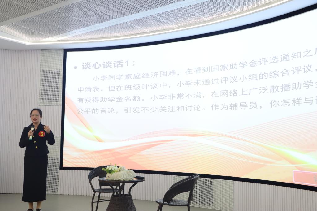 在谈心谈话环节,参赛选手通过情景再现的方式与学生交流,针对学生在学生资助、学习规划、人际关系、网络舆论、就业工作、网络诈骗等方面存在问题和困惑进行深入谈心谈话。谈话过程中,参赛选手沉着冷静,把握学生特征及成长成才规律,找准问题根源,并施以正确的教育引导,展现了辅导员过硬的专业本领。