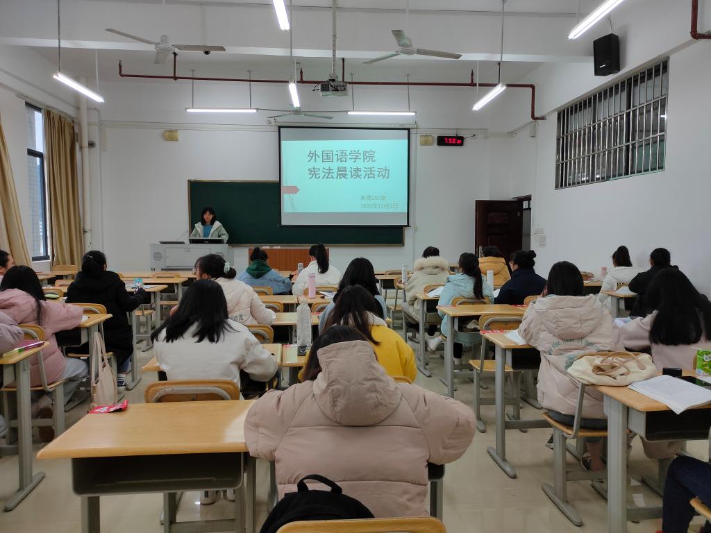 2020年12月4日是第七个国家宪法日。为认真学习贯彻习近平法治思想,弘扬宪法精神,维护宪法权威,根据《自治区教育厅关于开展2020年教育系统“宪法宣传周”系列活动的通知》要求,167net必赢入口围绕“深入学习宣传习近平法治思想,大力弘扬宪法精神”主题组织开展了“宪法晨读”活动。