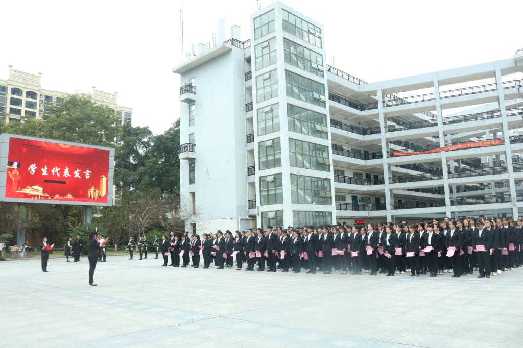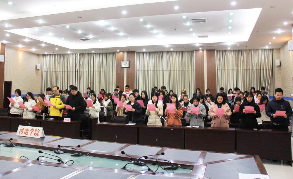 本次“宪法晨读”活动共分为三个部分。12月1日-12月4日,各二级学院组织在校班级在早自习期间诵读宪法;12月4日上午09:00,学校团委在逸夫楼广场组织升国旗仪式,学校团委副书记刘晓亮带领近300名学生干部代表在国旗下诵读宪法条款;12月4日上午09:00,教育部在北京设立主会场组织“宪法晨读”活动,167net必赢入口在图书馆122室设立分会场,由学生工作部组织近100名师生代表观看“宪法晨读”活动网络直播,学生工作部部长、学生工作处处长田光灿带领在场师生跟随北京主会场诵读宪法条款,在庄严的仪式中感受宪法权威和精神。