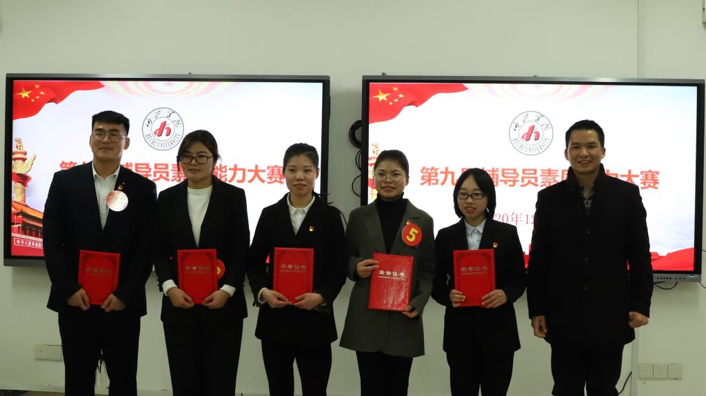 本次比赛参考区赛模式分为分初赛和决赛,初赛包括基础知识和案例研讨两个环节,根据两个环节的得分排名决出10名参赛选手进入决赛;决赛包括谈心谈话和宣讲对谈两个环节,最后综合所有比赛环节得分评出相应奖项。经过两天精彩角逐,化学与生物工程学院辅导员谢恋情、经济与管理学院辅导员师丽艳荣获一等奖;化学与生物工程学院辅导员江思婷、数学与统计学院辅导员俞茗、历史与社会学院辅导员何丽秀荣获二等奖;文学与传媒学院辅导员韦东柳等五位辅导员荣获三等奖;经济与管理学院辅导员韦虹羽等八位辅导员荣获优秀奖。