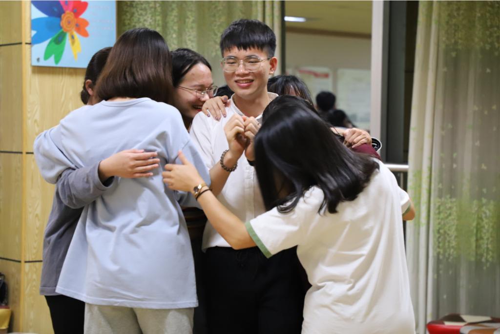 一个轻松欢快的热身小游戏“天气播报”拉开了本次活动的序幕。“小雨越下越大变成了中雨,突然一阵雷鸣,下起了雷阵雨……”,在主持人生动的描述下,同学们认真倾听,用心去感受,并迅速反应,作出相对应的动作。欢声笑语不断,气氛渐渐地活跃起来。随后的“同舟共济”环节把活动氛围推向了高潮。在游戏中,为了保证团队中的每一个人不掉进“海”里,在一次次的挑战中同学们集思广益、齐心协力、相互信任,不断的去尝试,紧紧地抱在一起,最终完成了挑战,团队的凝聚力在这一刻得到了充分的体现。生活也是如此,只要我们一起努力才能达成共同的目标,才能实现人生价值。