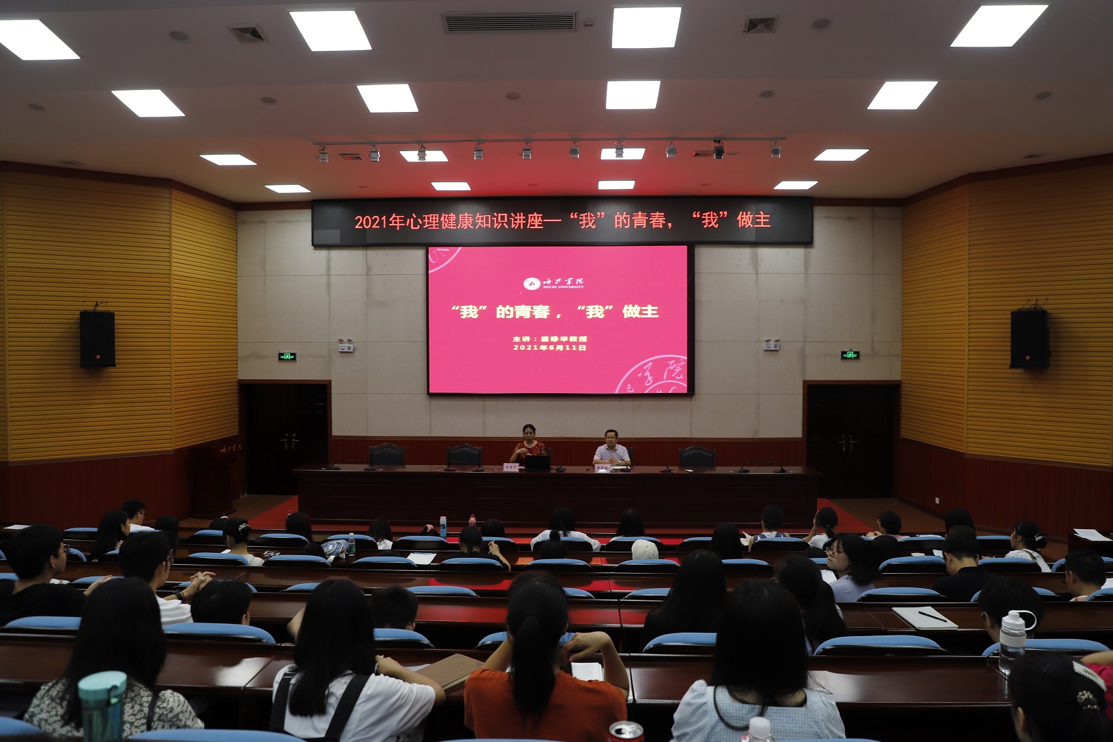 本次讲座的主题是“‘我’的青春,‘我’做主”,唐教授首先介绍了我们的青春包括健康、学业、爱情、友情等各方面,给大家分享了如何实现人生梦想的方法:明志向,定目标。从小目标开始,尽快明确大目标。接着唐教授从认识自己,接纳独一无二的自己;面对挫折,拓展思维,多角度评析事件;积极应对学习压力,学会理解自己的学习;主动交友,选择“好”的朋友;心理难受时,敢于和善于主动求助;了解自己有没有心理感冒,情绪情感方面出现问题要早发现,早诊治;对美好爱情的憧憬要理性等七个方面讲述了如何提高我们的心理健康。最后,提问环节,同学们踊跃发言,唐教授对同学们的问题耐心的做了回应,现场气氛活跃。