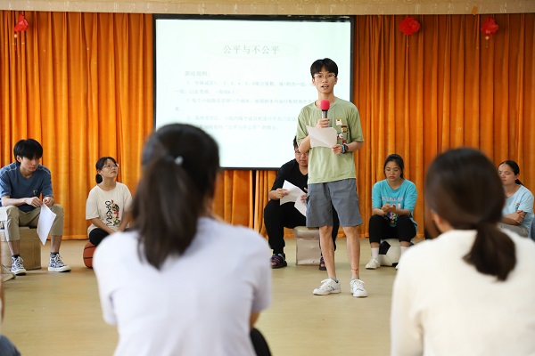 本次活动围绕“天天向上”这个主题,设计了四个环节。首先,一首令人热血沸腾的歌曲《天天向上》拉开了此次活动的序幕。在主持人的带领下,同学们共同欢唱《天天向上》,激起了同学们青春年少的澎湃热血。第二环节是“积极进取”,同学们积极主动,与身边的小伙伴介绍自己最擅长的职业后,迅速调整好自己的心态去面对即将抽取到的不擅长职业,对于不擅长的领域,同学们该怎么激发自己的潜能与兴趣呢?术业有专攻,我们总会有遇到自己不擅长的领域,只要我们适时调整自己的心态,善于运用自己所学的知识与技能来应对未知领域的挑战,积极进取,奋勇拼搏,我们也能在新的领域中学有所获。在“勇于承担责任”环节中,同学们认真听从主持人的口令,严格按照口令来做动作,做错动作的同学在主持人与其他同学的鼓励下,勇敢站到队伍面前承认错误。人非圣贤,孰能无过?只要我们敢于承认错误,不逃避,不退缩,承担我们的责任,我们一定可以突破自我,更上一层楼。最后,同学们通过演绎“公平与不公平”里的角色,来分享自己如何看待公平与不公平的现象。人的一生当中会遭遇许多的不公平,我们在面对生命中的不公平时,要调整自己心态,用积极的态度去面对,同时应该提升自身本领,打破不公平的局面,逐渐升华我们的人生价值,成就不平凡的人生。