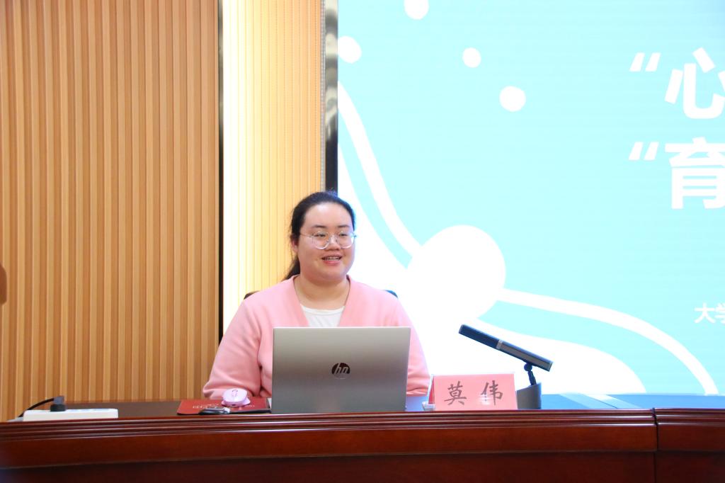 培训中,莫伟围绕“我为什么而来”、“我是什么”、“我可以做什么”、“我该怎么做好”等四个方面,用生动的语言、形象的案例阐释了心理健康的重要性、心理委员的角色定位、心理委员的职责以及心理委员的工作素养,向同学们普及了心理健康的标准、心理健康的重要性、常见的心理问题等。她指出,作为心理委员应该扮演好示范者、传声员、觉察者以及支持者的角色,积极参加心理健康知识的培训,在班级里组织开展心理健康知识宣传活动,主动帮助身边的同学,发现同学出现心理方面的危机事件时,迅速准确地报告给班主任、辅导员,以便同学能够及时获得专业老师的帮助。