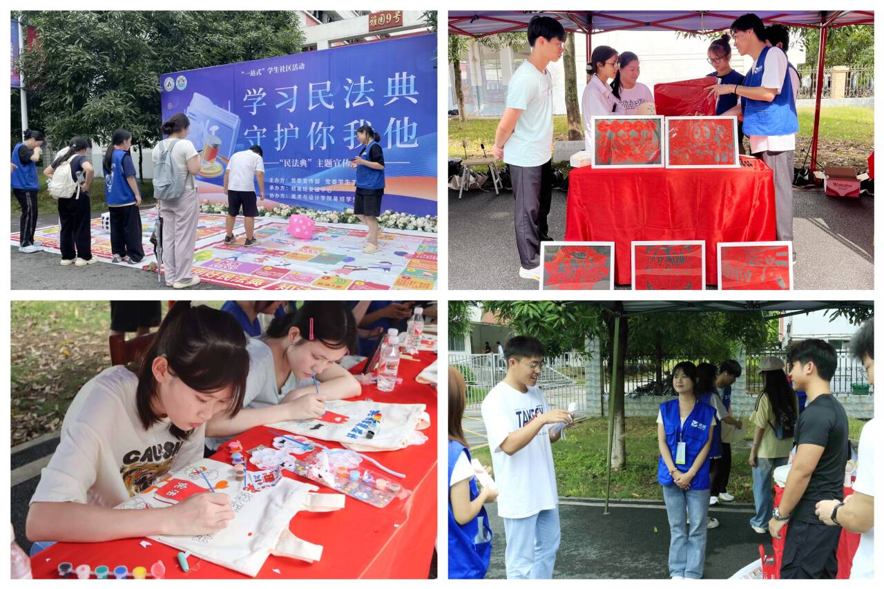 线下活动现场气氛热烈,亮点纷呈。“‘易’起飞行,‘棋’遇民法典” 环节,以真人飞行棋形式将法律条文融入游戏任务;“非遗遇法典,手作传法治” 区域,剪纸、蒲扇 DIY、帆布包彩绘等非遗体验巧妙融合民法典元素;“‘易’画‘易’猜,民法火起来” 互动中,师生通过词语竞猜、场景模拟,让法律知识变得通俗易懂。