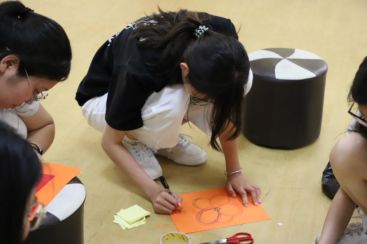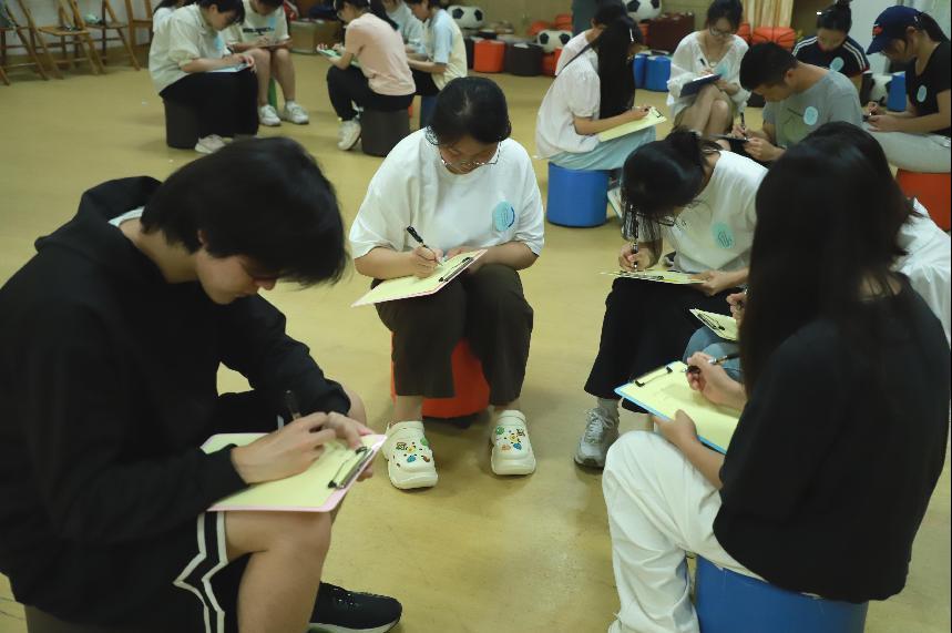 在“锁定圆心”环节,每位同学在彩纸上写下五个近期目标,并通过主持人的引导逐步筛选出最重要的一个。这一过程引导同学们深入探索内心的真实需求,逐步明确核心目标,让希望的种子在心田中悄然萌发。