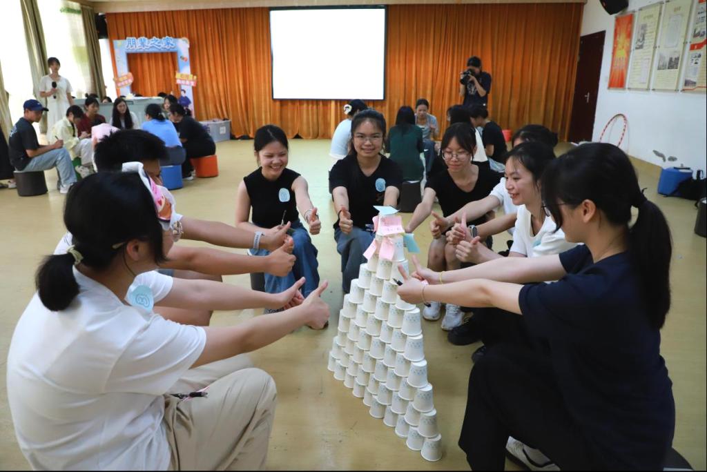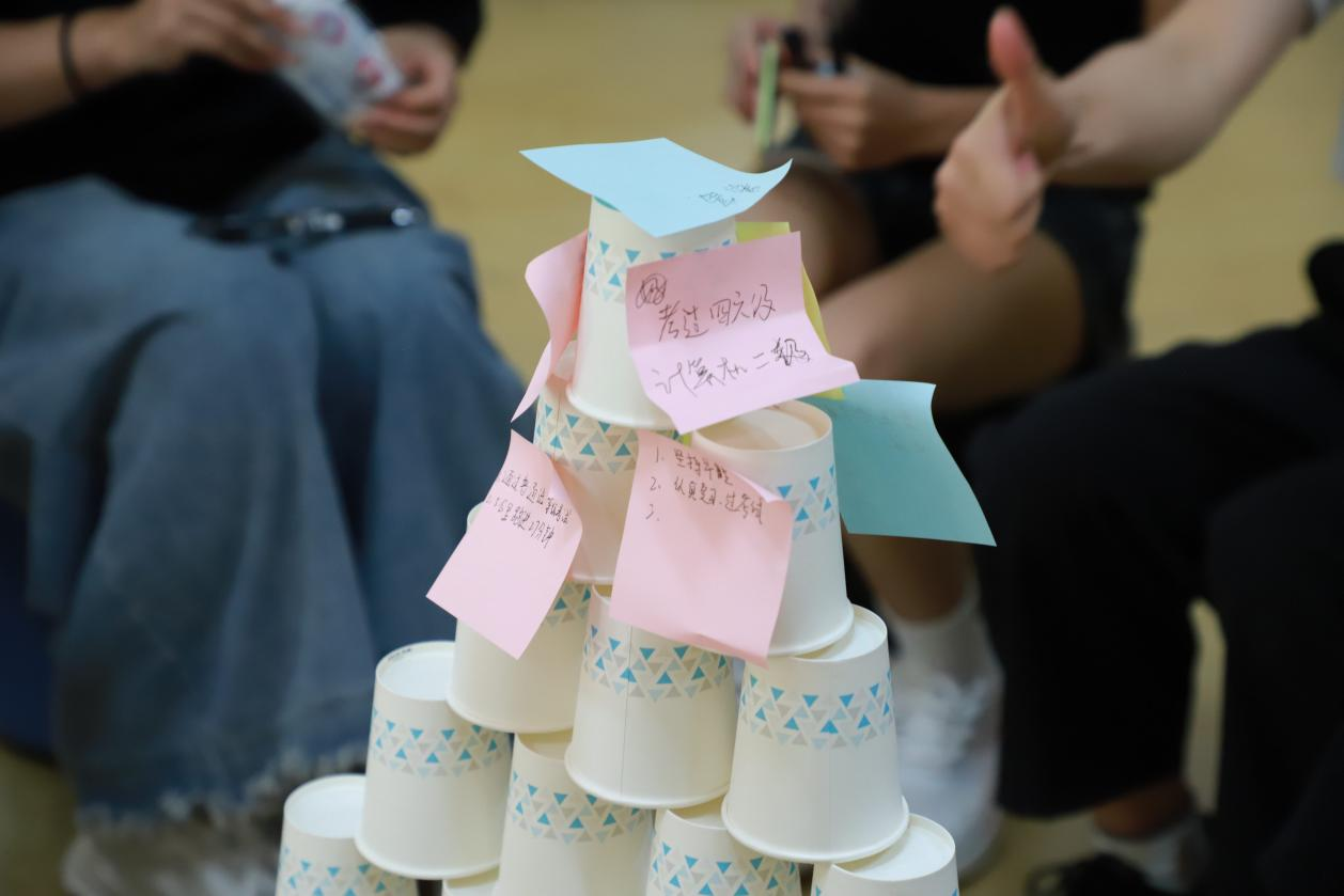 “搭建希望之塔”这一活动中,各小组用50个纸杯搭建象征目标的“高塔”,却在突如其来的“龙卷风”(模拟突发干扰)中遭遇坍塌。短暂的沮丧后,同学们迅速调整策略,投入重建。这一环节以实践形式传递了“韧性成长”的理念:目标因挑战而坚定,努力因坚持而闪光。